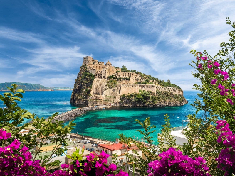 - Commencez par Ischia Ponte et sa célèbre forteresse du “Castello Aragonese” perchée en haut de cet îlot d’origine volcanique.